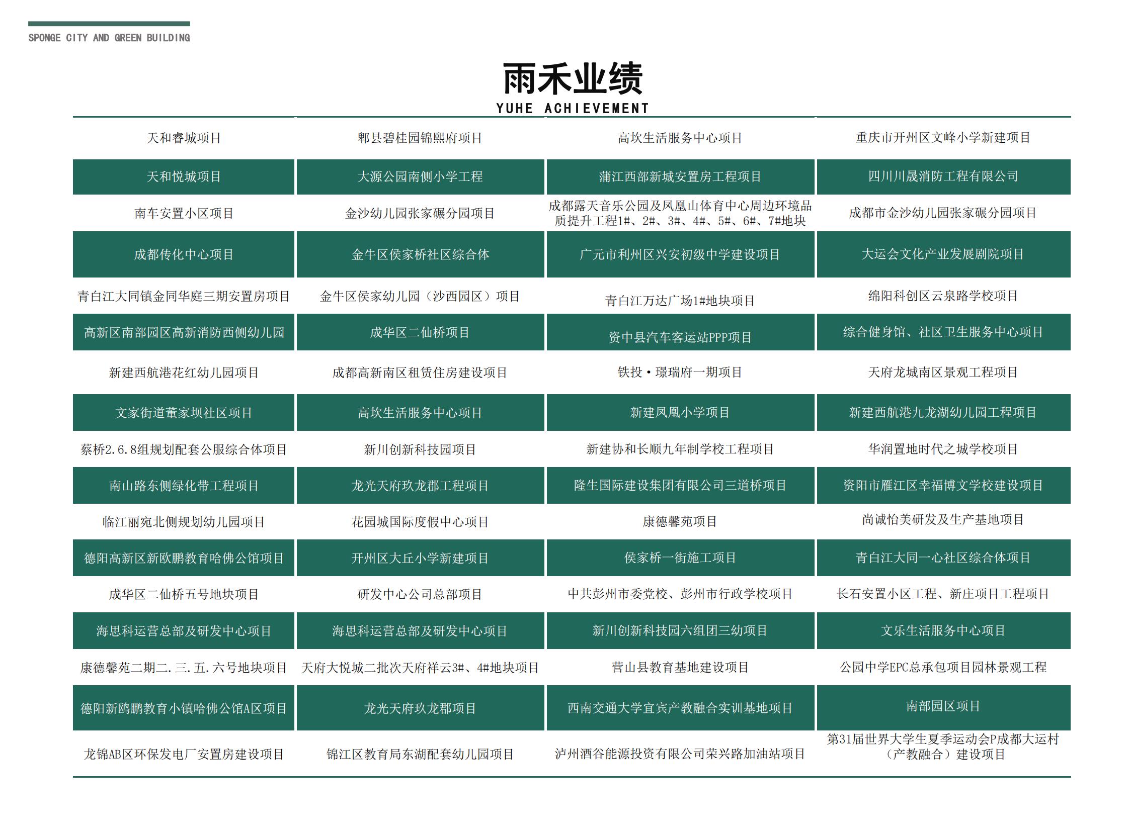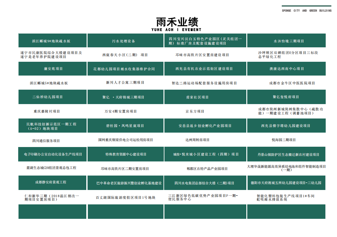 目前雨禾生态旗下有海綿城市建設與水處理、城市生态風貌打造與生态修複、生态發展與低碳踐行、鄉村振興規劃建設與設計、金融服務五個闆塊。海綿城市建設與水處理有兩家專業從事海綿城市建設及咨詢的公司,對雨水收集、虹吸排水、中水污水處理、環保設備等進行研發生産;城市生态風貌打造與修複有專業從事市政景觀綠化與生态修複的高科技企業,對城市新建老城區建築、公園城市風貌提升進行輕質新型屋面綠化打造、城市立體綠化亮化建設、城鎮邊坡修複、土壤修複、鄉村振興建設進行專業打造;低碳闆塊有零排放技術生産服務公司,可對企業節能降碳提供零排放方案與産品技術服務,對接碳彙金融,爲碳中和碳達峰做好企業服務;金融服務闆塊有投融資專業資格合作夥伴單位,在基層金融領域開行通過獨特的信用建設、市場建設和機制建設,打通三農、教育、環保、醫療衛生、中低收入家庭住房、中小企業等領域的金融瓶頸,同時加大支持國家對城市化和産業發展産業振興規劃的實施,促進文化、高科技産業和綠色經濟、低碳經濟發展。